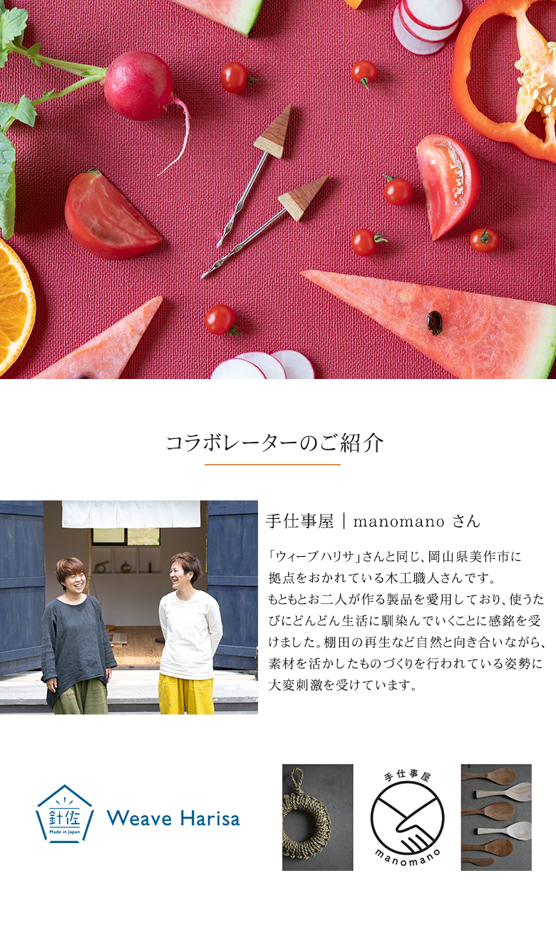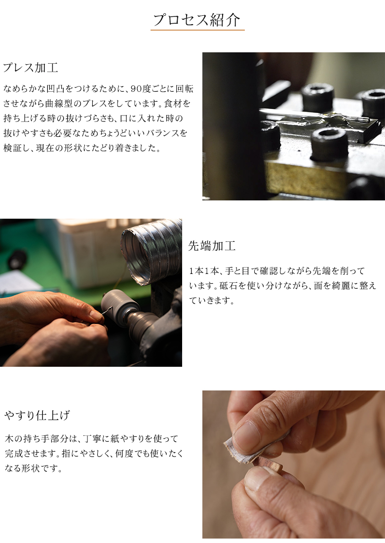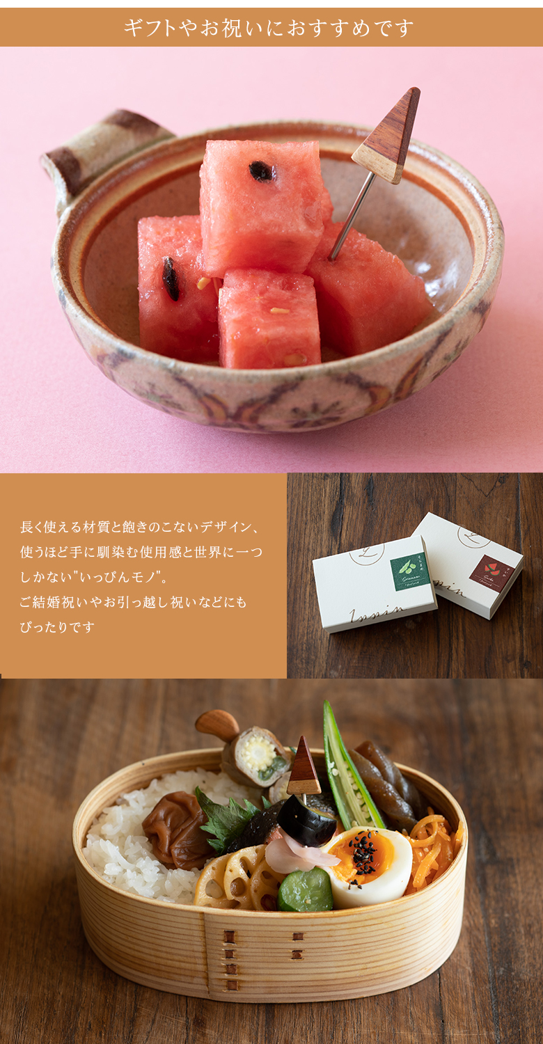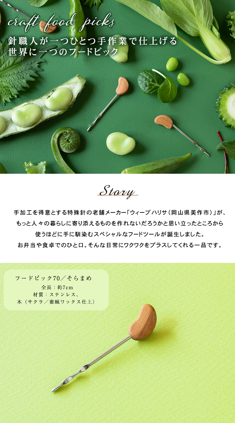 [商品説明]手加工を得意とする特殊針の老舗メーカー「ウィーブハリサ(岡山県美作市)」が、もっと人々の暮らしに寄り添えるものを作れないだろうかと思い立ったところから使うほどに手に馴染むスペシャルなフードツールが誕生しました。お弁当や食卓でのひと口。そんな日常にワクワクをプラスしてくれる一品です。すべての工程を目で見て手で触って確認しながら仕上げています。手作業のため微妙に個体差ができますが、それもまた愛着に変わってくれたらうれしいです。経年変化も楽しみながら長く使っていただきたいという思いから、ピックには錆びづらく丈夫なステンレスを使用。木工職人により厳選された、木の持ち手は使えば使うほど手に馴染み、味が出てきます。長く使える材質と飽きのこないデザイン、使うほど手に馴染む使用感と世界に一つしかない"いっぴんモノ"。ご結婚祝いやお引っ越し祝いなどにもぴったりです!