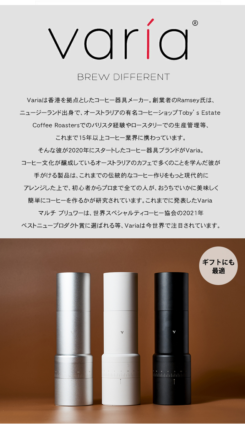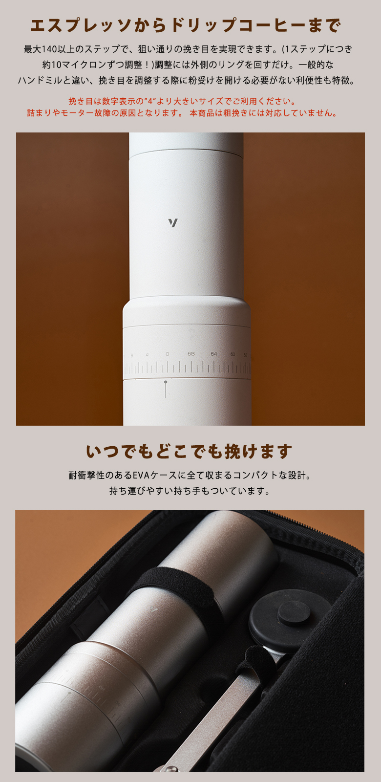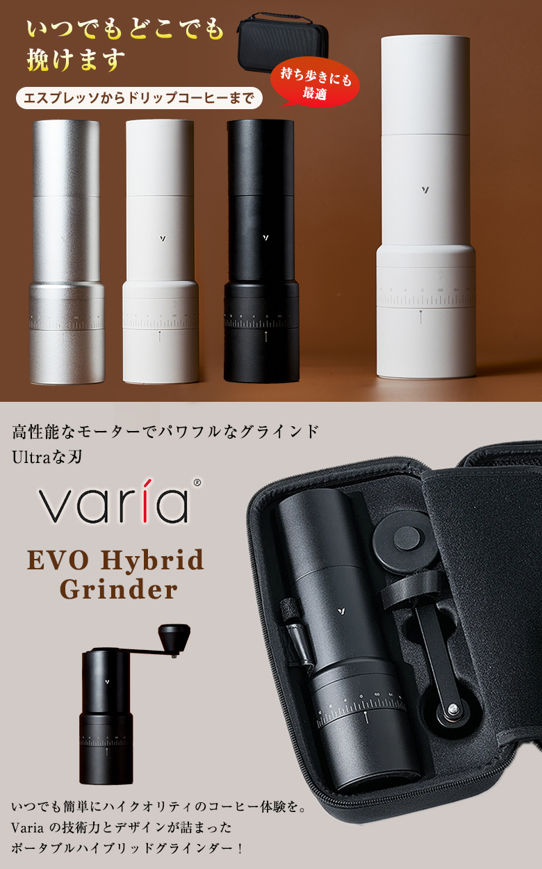 [商品説明]いつでも簡単にハイクオリティのコーヒー体験を。Varia の技術力とデザインが詰まったポータブルハイブリッドグラインダー!・エスプレッソからドリップコーヒーまで・いつでもどこでも挽けます・高性能なモーターでパワフルなグラインド・Ultraな刃