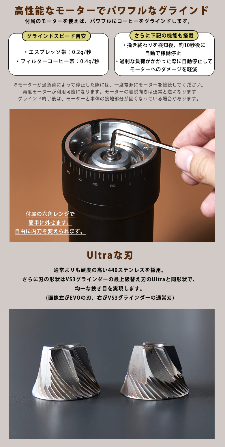 [注意事項]モーター規格:80RPM ブラシモーター40W刃の素材:イニトロゲン440ステンレススチール挽き目の幅:極細挽き、細挽き、中挽き容量:30g (浅煎り豆の場合)重さ/サイズ・モーター装着時:約1.24kg / 高さ219mm、 直径(最大) 64mm・お子様の手が届くところでの使用、保管はしないでください。・本来の目的(コーヒー豆を挽くこと)以外には使用しないでください。・付属の取扱説明書をよく読み、正しくご利用ください。・ 重要:EVOはエスプレッソとフィルターの両方の挽き目に対応できるように作られていますが、とても浅煎りのコーヒー豆の場合、エスプレッソなど極細の挽き目の際に刃が噛み込んでしまう場合があります。(ロースト度合いと豆の種類によります)。とても浅煎りのコーヒー豆を挽くときは細心の注意を払い、豆をゆっくり投入するか、粗い挽き目に調節してください。・本製品は家庭用です。・粗挽きはできませんのでご注意ください・モーターが過負荷によって停止した際には、一度電源にモーターを接続してください。再度モーターが利用可能になります。