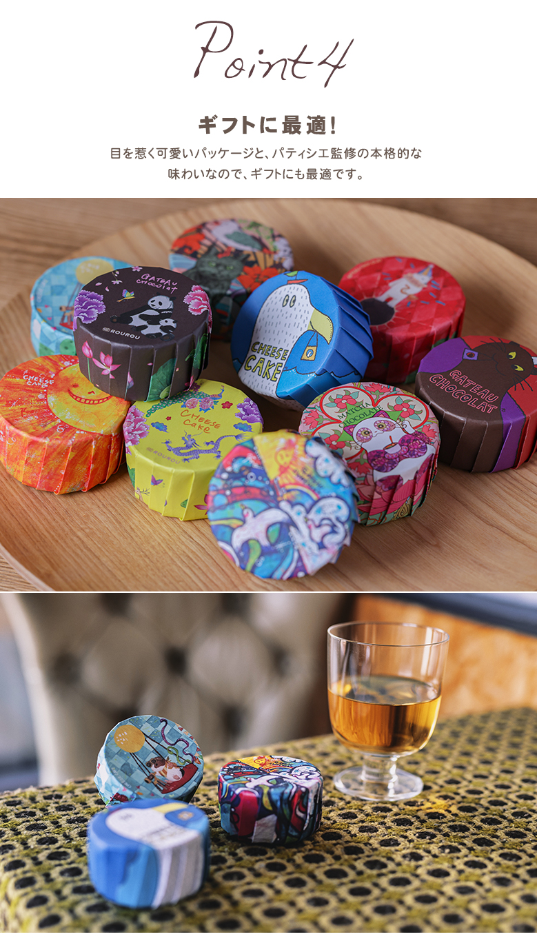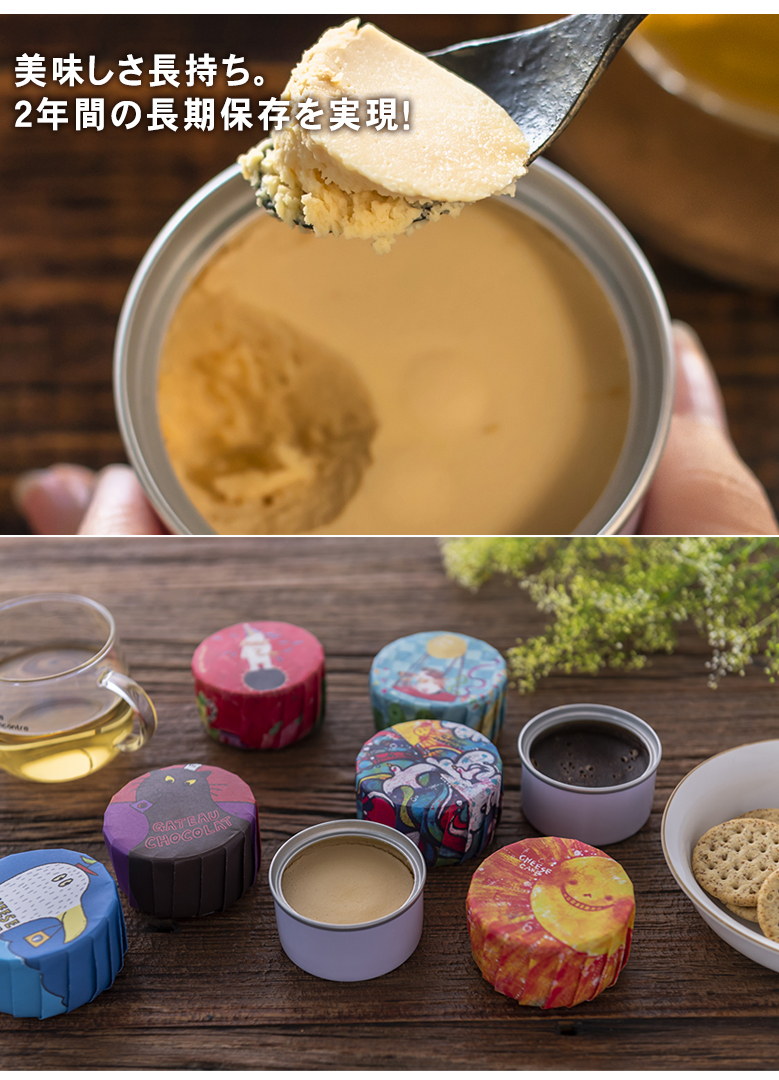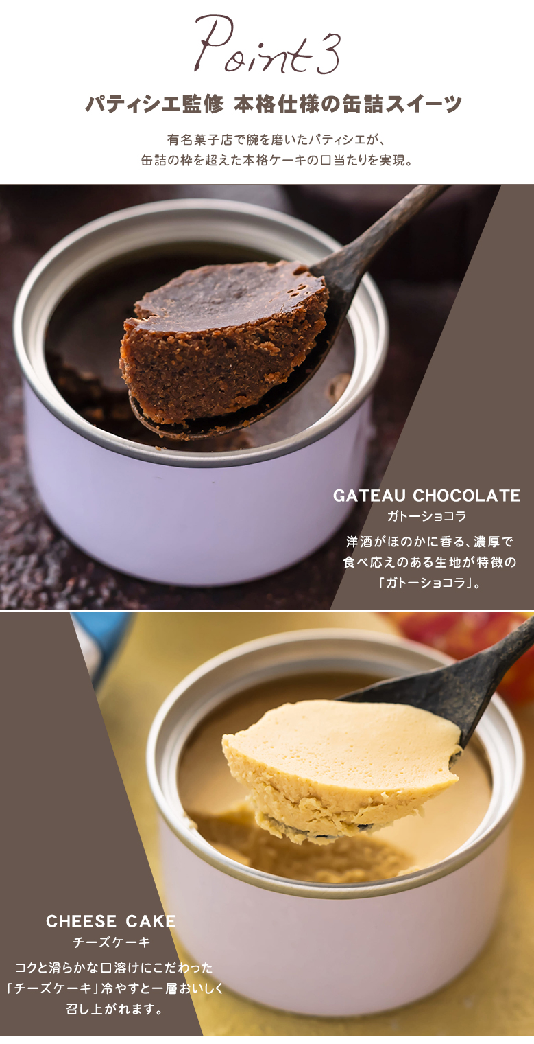 かわいいパッケージに包まれた中には缶詰に入ったチーズケーキとガトーショコラ。いつたべてもおいしさそのまま、パティシエ監修の本格派スイーツです。