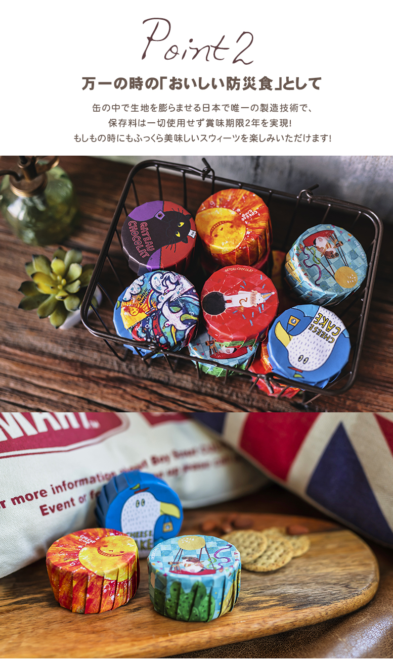 [商品説明]かわいいパッケージに包まれた中には缶詰に入ったチーズケーキとガトーショコラ。いつたべてもおいしさそのまま、パティシエ監修の本格派スイーツです。もしもの時の保存食。また可愛いパッケージでギフトにも最適です。