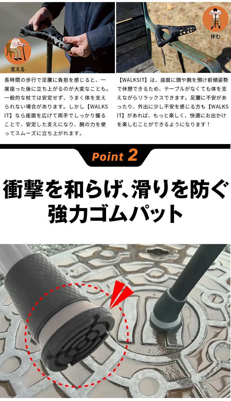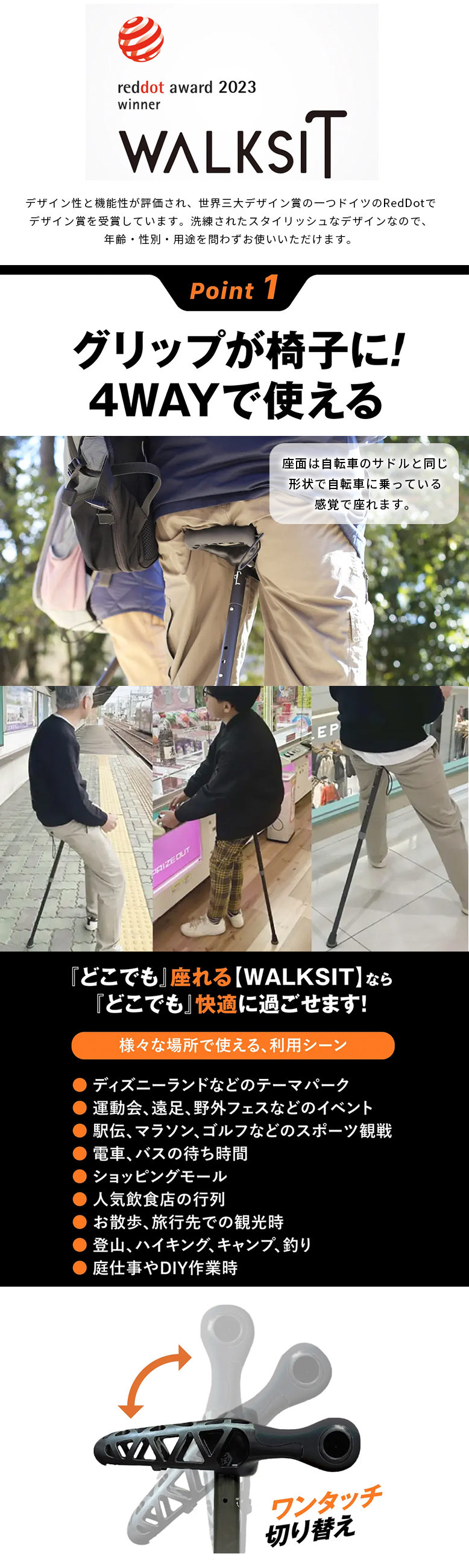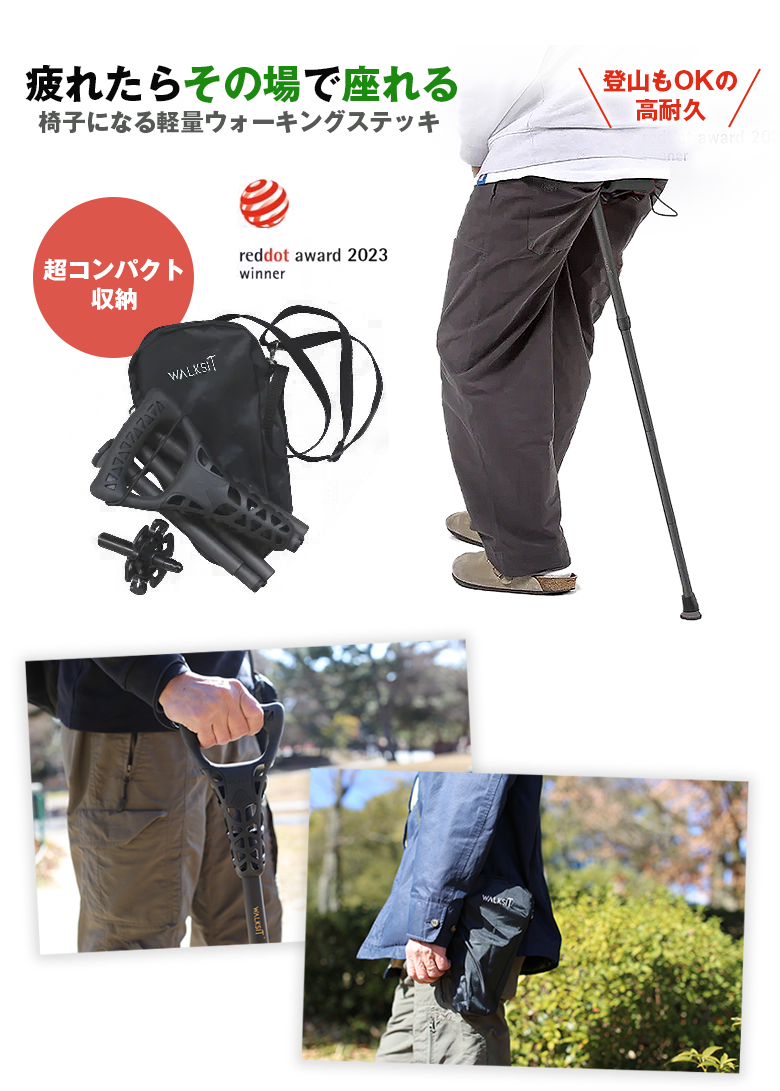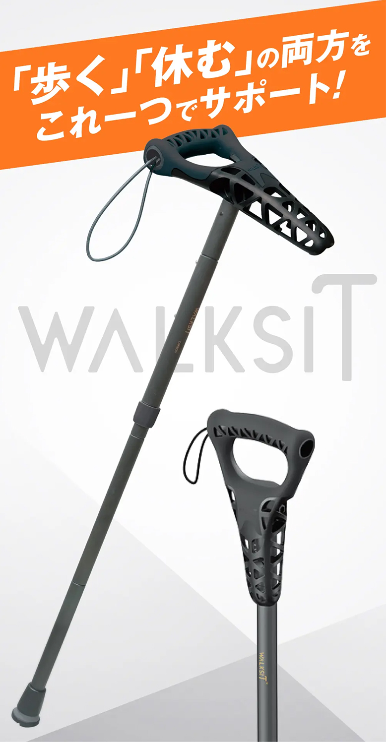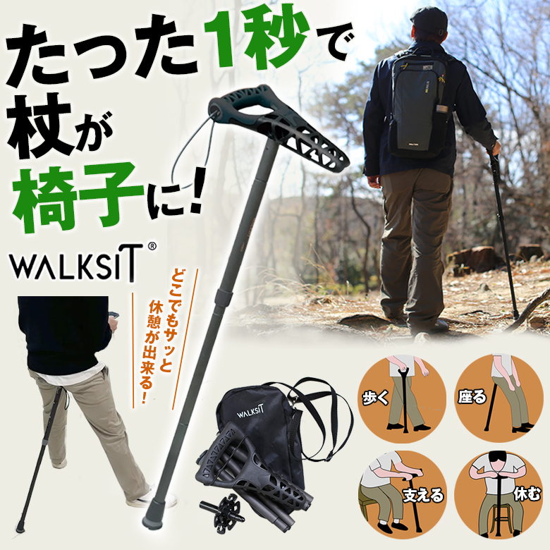 【WALKSIT】は、その場で座れるチェアー一体型のウォーキングステッキです!