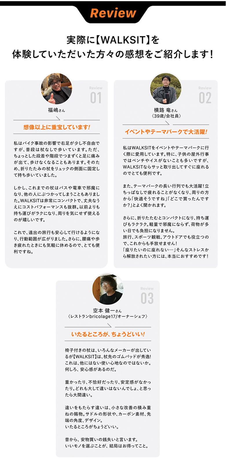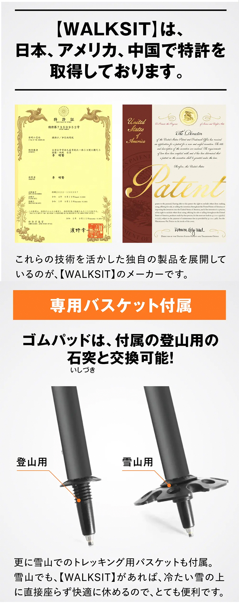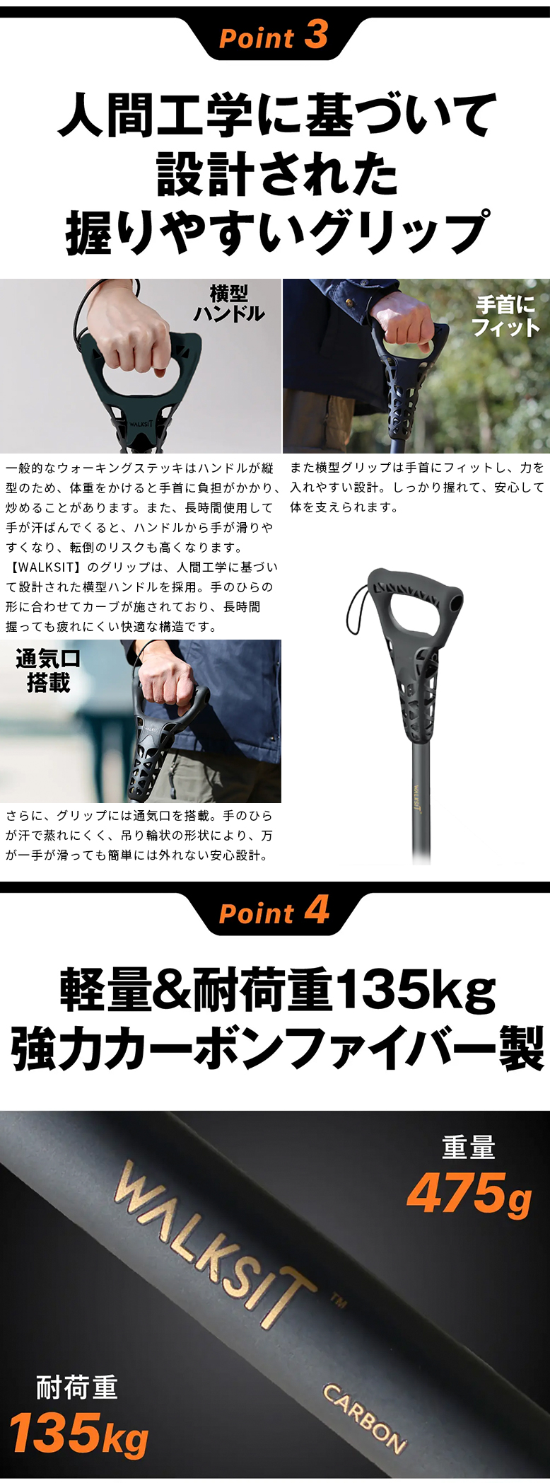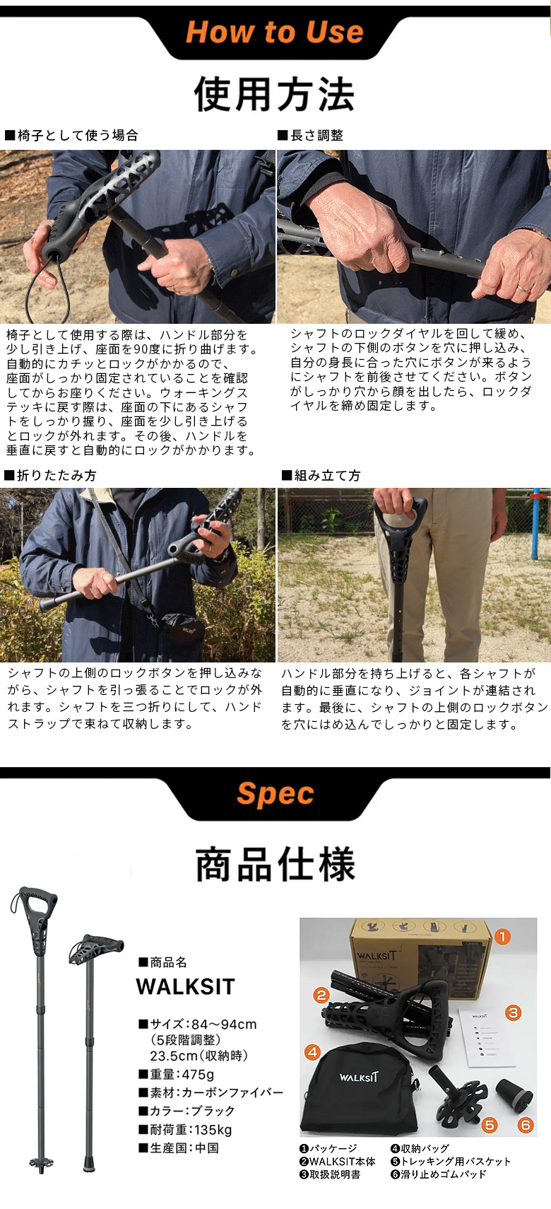 【WALKSIT】は、その場で座れるチェアー一体型のウォーキングステッキです!