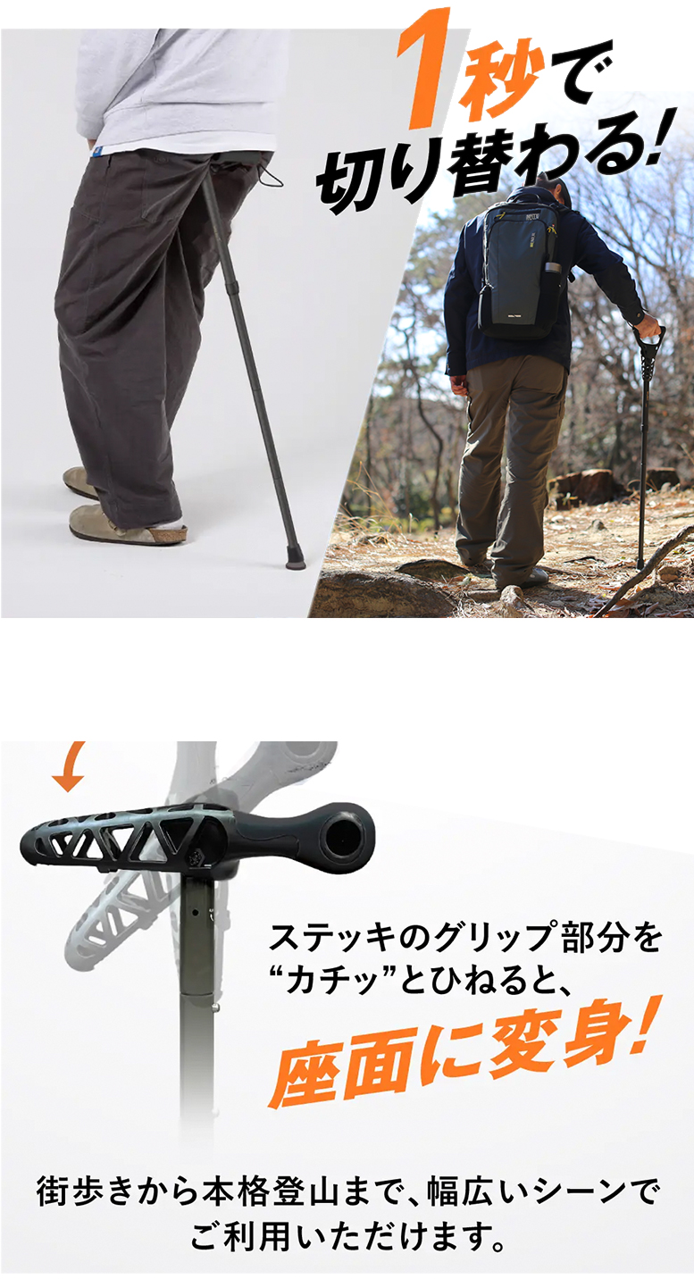 場所も取らず、ワンタッチでウォーキングステッキと椅子を切り替え可能。