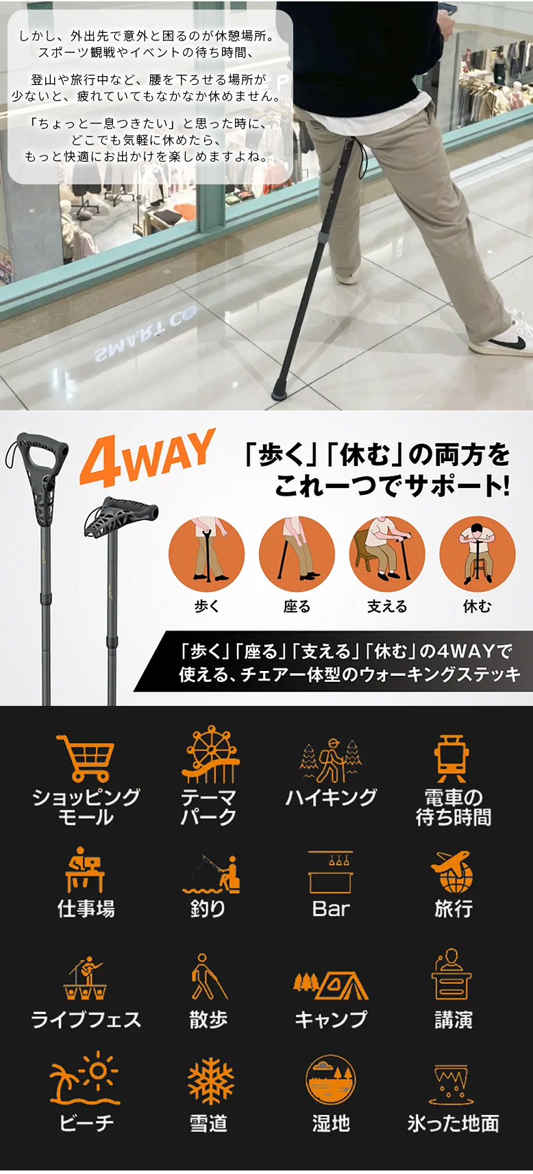 【杖が椅子に変身】どこでもサッと休憩!歩く・座る・支える・休む、4WAYウォーキング