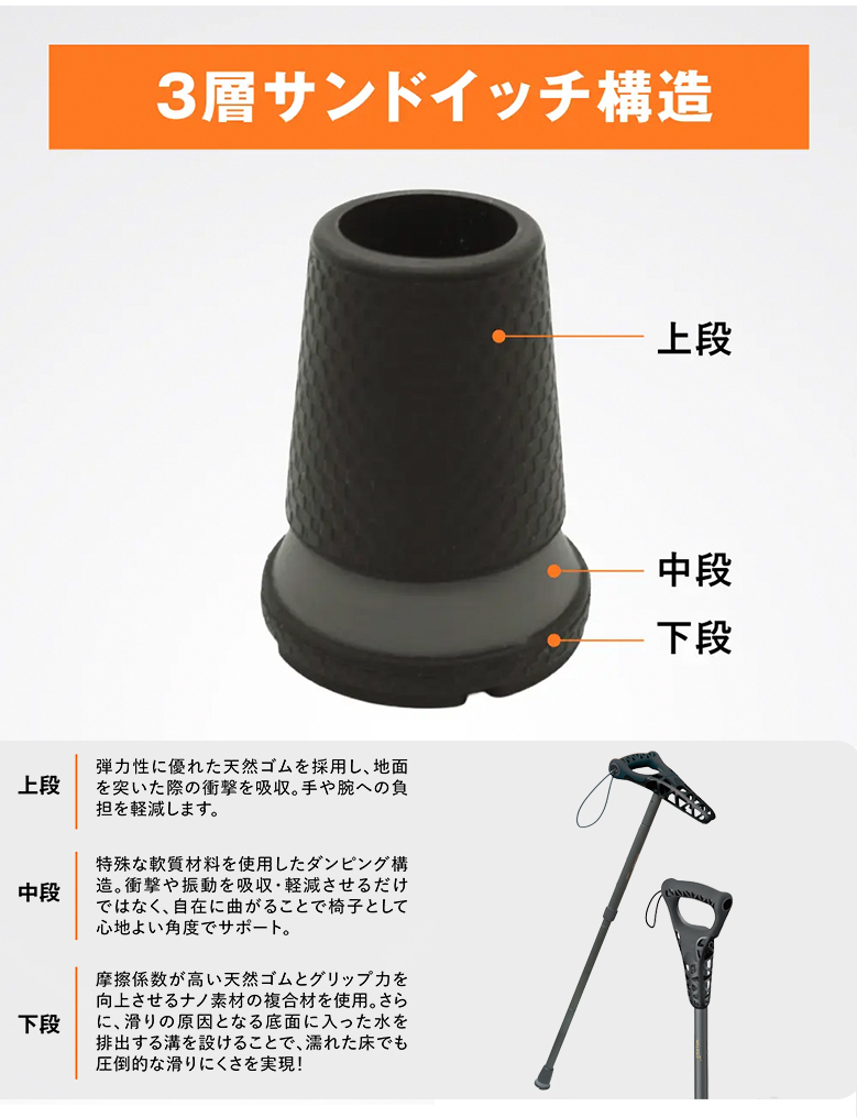 【WALKSIT】の石突は、メーカー独自開発の3層サンドイッチ構造を採用。目的に応じた異なる素材を組み合わせることで、高い耐久性とグリップ力を実現しました。