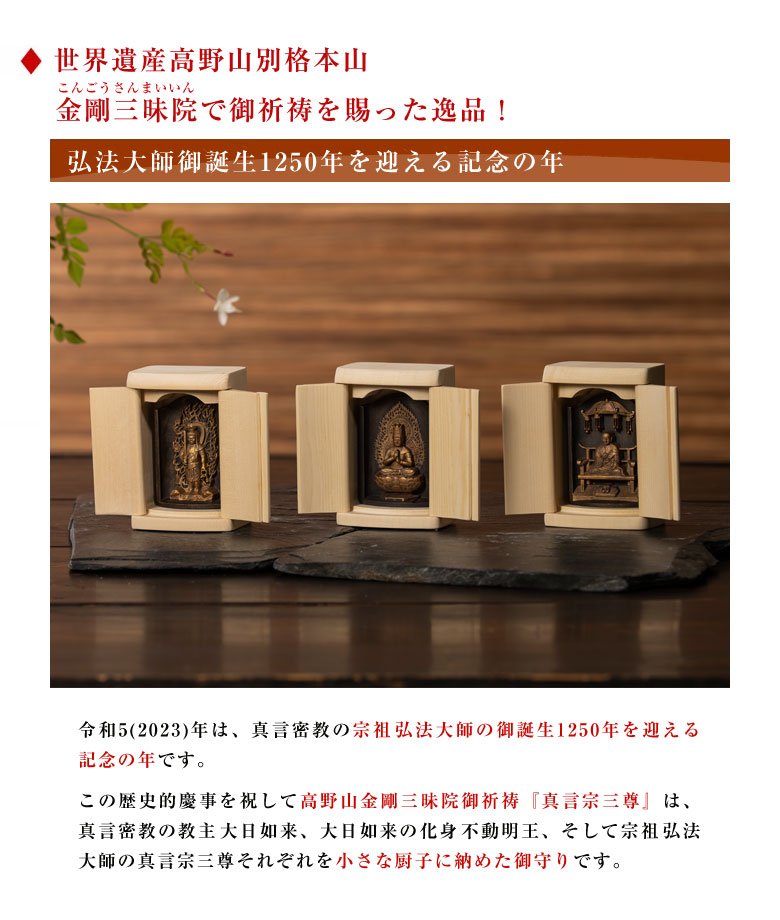| 商品説明 | 弘法大師御誕生1250年の歴史的慶事を祝し、≪世界遺産≫高野山別格本山 金剛三昧院で御祈祷を賜った逸品! 令和5(2023)年は、真言密教の宗祖 弘法大師の御誕生1250年を迎える記念の年です。この歴史的慶事を祝して発売する高野山金剛三昧院御祈祷 単尊は、真言密教の教主 大日如来、大日如来の化身 不動明王、そして宗祖 弘法大師をそれぞれを小さな厨子に納めた御守りです。(いずれか、おひとつお選びください。) シンプルなデザインの厨子の扉を開くと、金古美仕上げの厳かなお姿を現します。『大日如来』『不動明王』『弘法大師』の単尊は、すべて世界遺産登録を受ける高野山真言宗の別格本山 金剛三昧院で御祈祷を賜り、より一層価値を高めて皆さまのお手元にお届けします。 |