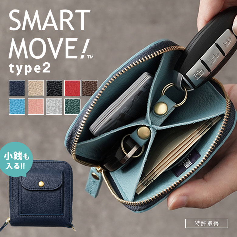 [商品説明]ジャラジャラする鍵と財布の中身 なんとかすっきりまとめたい! 累計販売数10000個を突破。スマートキー2個+アナログキー3本、紙幣やカード類までがポケットサイズに収まるSMART MOVE!(スマートムーブ)。お出かけの必需品がきちんと整理されて収まるケースに外側コインポケットが付いた「type2」が登場。