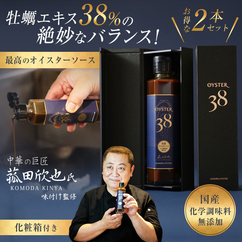[商品説明]国産・化学調味料無添加。そのまま食べても美味しい、牡蠣エキス38%のベストバランス。牡蠣本来の香りとコクを持った、最高のオイスターソース「Oyster38(オイスターサーティエイト)」。身が大きく、風味・味・栄養・すべてにおいて食べやすい播州赤穂のブランド牡蠣「サムライオイスター」を使用し、今もっとも勢いのある中華シェフの一人、菰田欣也シェフが味作りを手掛けたスペシャルなオイスターソースです。