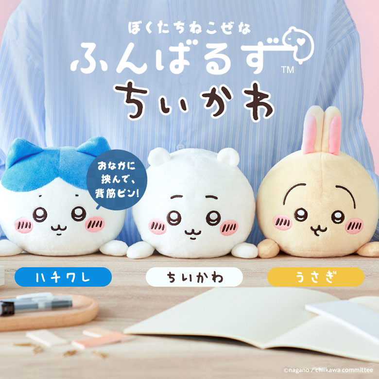 [商品説明]子どもから大人まで幅広い層に人気の「ちいかわ」が、机とおなかの間に挟むことで、あなたの姿勢をサポートしてくれるぬいぐるみ『ふんばるず』になって登場!ラインナップは、ちいかわ、ハチワレ、うさぎの3種類。ちいかわたちと一緒なら、普段よりもお仕事やお勉強を頑張れるかも!?