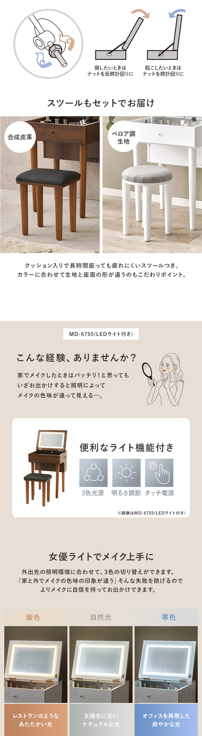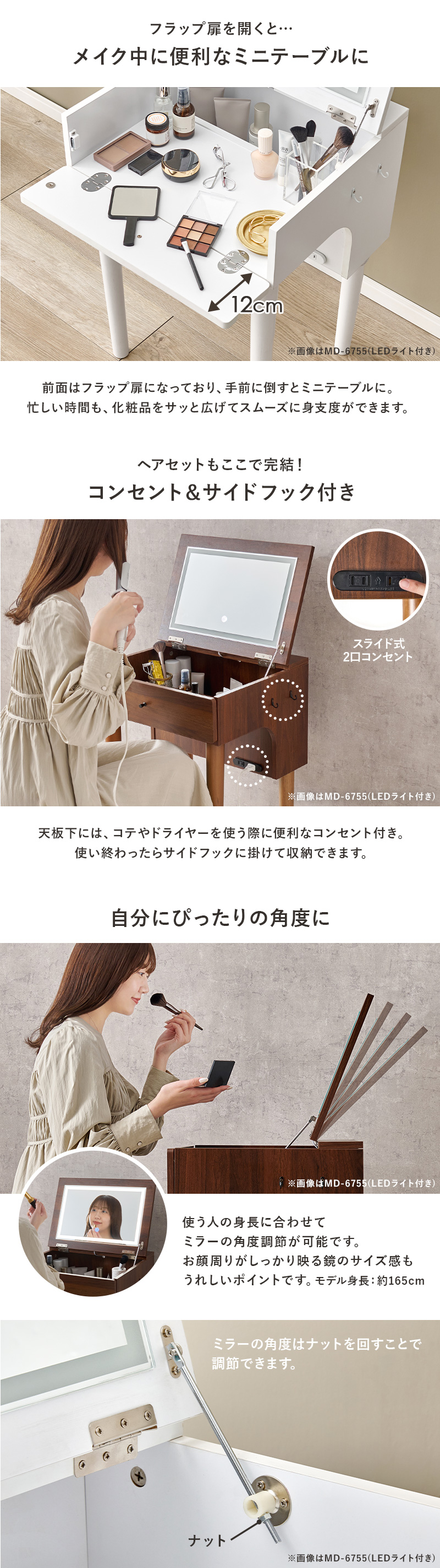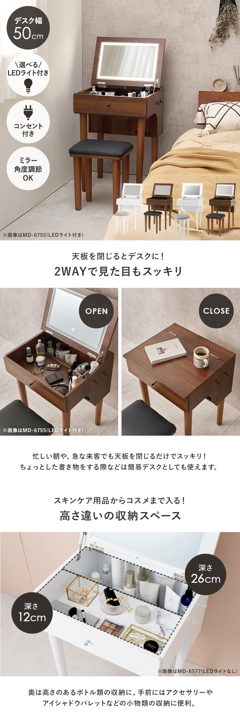 ドレッサー 化粧台 コンパクト 幅50cm ドレッサーデスク コンセント2口 スツール 白 茶 コンパクトドレッサー MD-6577 * (TD) (代引不可)