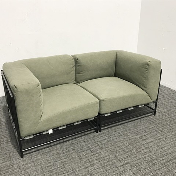 ウォッシュ加工の張地とブラックパイプフレームのヴィンテージ風ソファ。オフィスのロビーやリフレッシュスペースなど、さまざまなシーンでご使用いただけます。