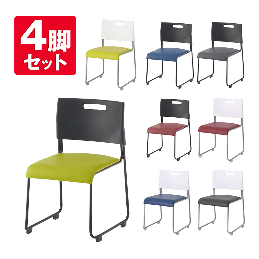 会議スペースや休憩スペース、セミナー、研修など、様々な場面で活躍するミーティングチェアです。4脚までスタッキングできるので、コンパクトに収納可能。座面には、柔らかな座り心地のPUレザーを使用しており、背には移動や重ねるときに便利な取っ手付き。カラーは全8色で、ホワイトとブラックの2色をベースに、座面は発色のよい4色をご用意しました。オフィスの雰囲気に合わせてお選びください。