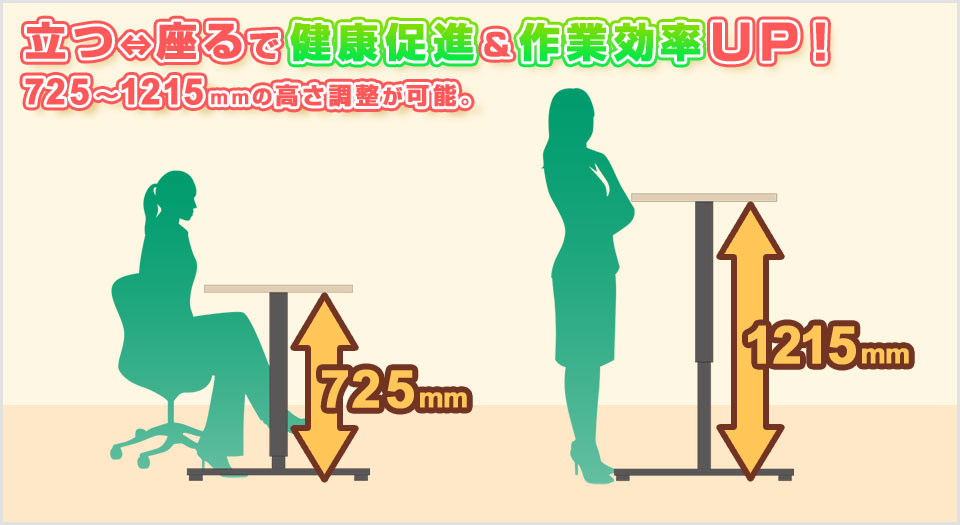 デスクワークの際に60分のうち10〜15分程度、立って仕事するだけで体への負担を軽減することができます。しかし120分以上立ち続けていると作業効率が低下するとも言われています。電動昇降デスクで臨機応変に姿勢を変えることで健康を促進し作業効率をアップさせます。