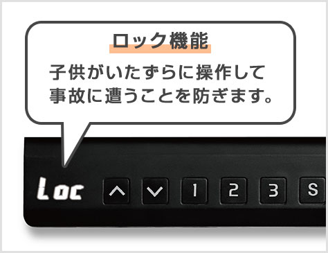 「上」「下」スイッチを同時に約5秒間押し続けることで操作パネルがロックされます。子供が勝手に操作することによる事故を防ぎます。
