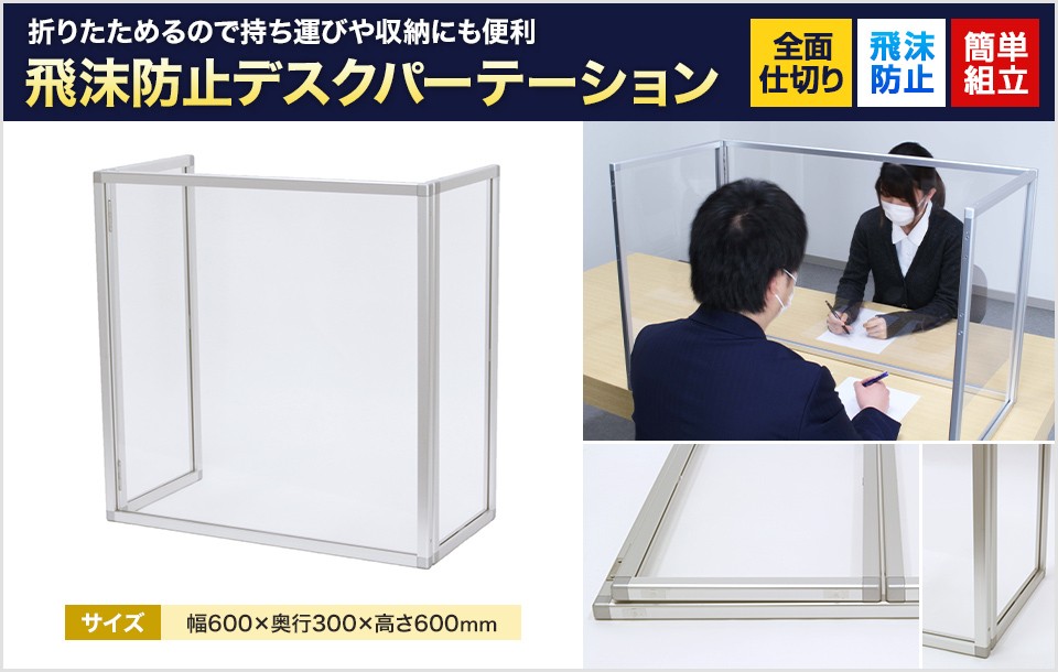飛沫感染防止に役立つデスクパーテーションです。オフィスのワークスペースや共有テーブル向けの全面仕切りタイプで、折りたたむことができる三面自立型で、持ち運びや収納にも便利です。フレーム付きのアクリルなので、丈夫で長くお使いいただけます。またフレーム部分を持てばアクリル面に手を触れずに設置できるので、アクリル面が汚れにくく、消毒がしやすいです。工事や取り付け加工も不要のため届いてすぐにお使いいただけます。