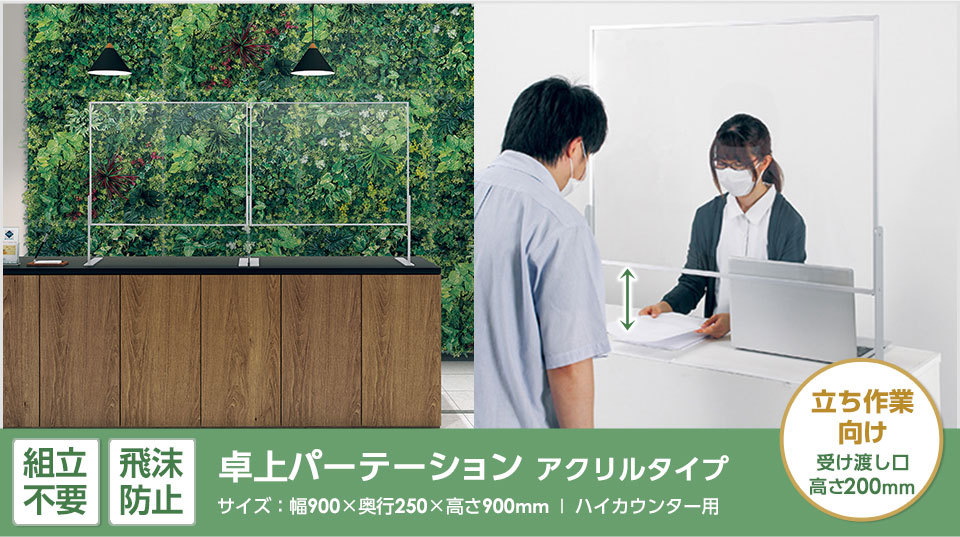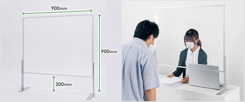 ハイカウンターでの対応や立ち作業に適した高さ900mm。パネル下部には高さ200mmの開口があり書類の受け渡しも可能です。