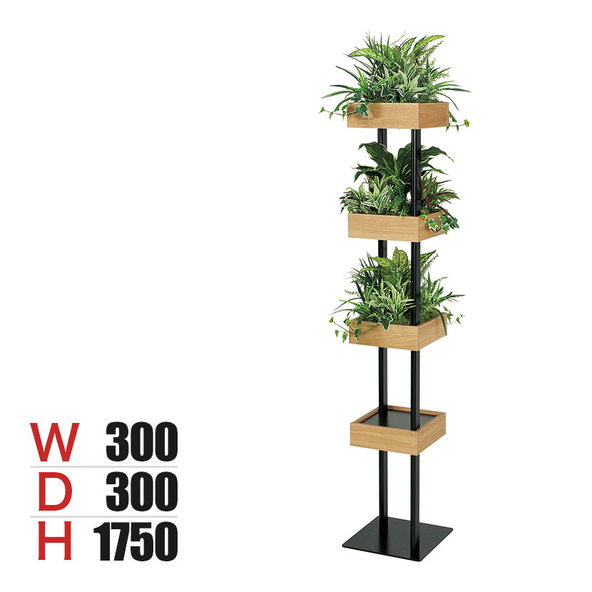 | 材質 | スタンド / アルミ押出材ブラックアルマイト仕上げ、スチールメッキ仕上げ、スチール焼付塗装 ポット / 木質ボード木目シート貼り仕上げ 装飾 / 造花、5.5mmベニヤシート貼り、ハッポー |