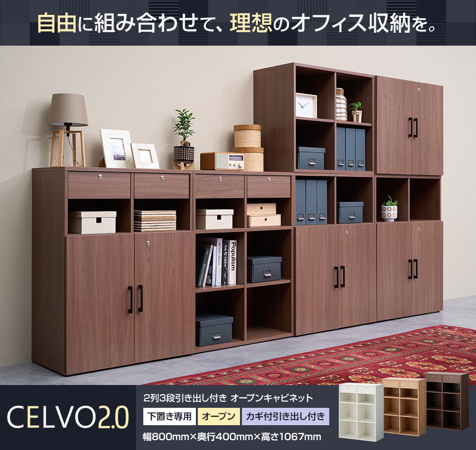 目的や空間に合わせて、自由な組み合わせができるユニット型収納「セルボ2.0 木製キャビネット」。下置き専用の2列3段引き出し付きオープンタイプです。一部に引き出しを備えた設計で、カラーはホワイト、ナチュラル、ダークブラウンの3色展開。ベーシックなカラーとシンプルなデザインが多様なシーンに調和します。単体での使用はもちろん、幅広いシリーズ展開を活かした多彩なアレンジが可能。それぞれの環境に応じた理想のオフィス収納を実現できます。