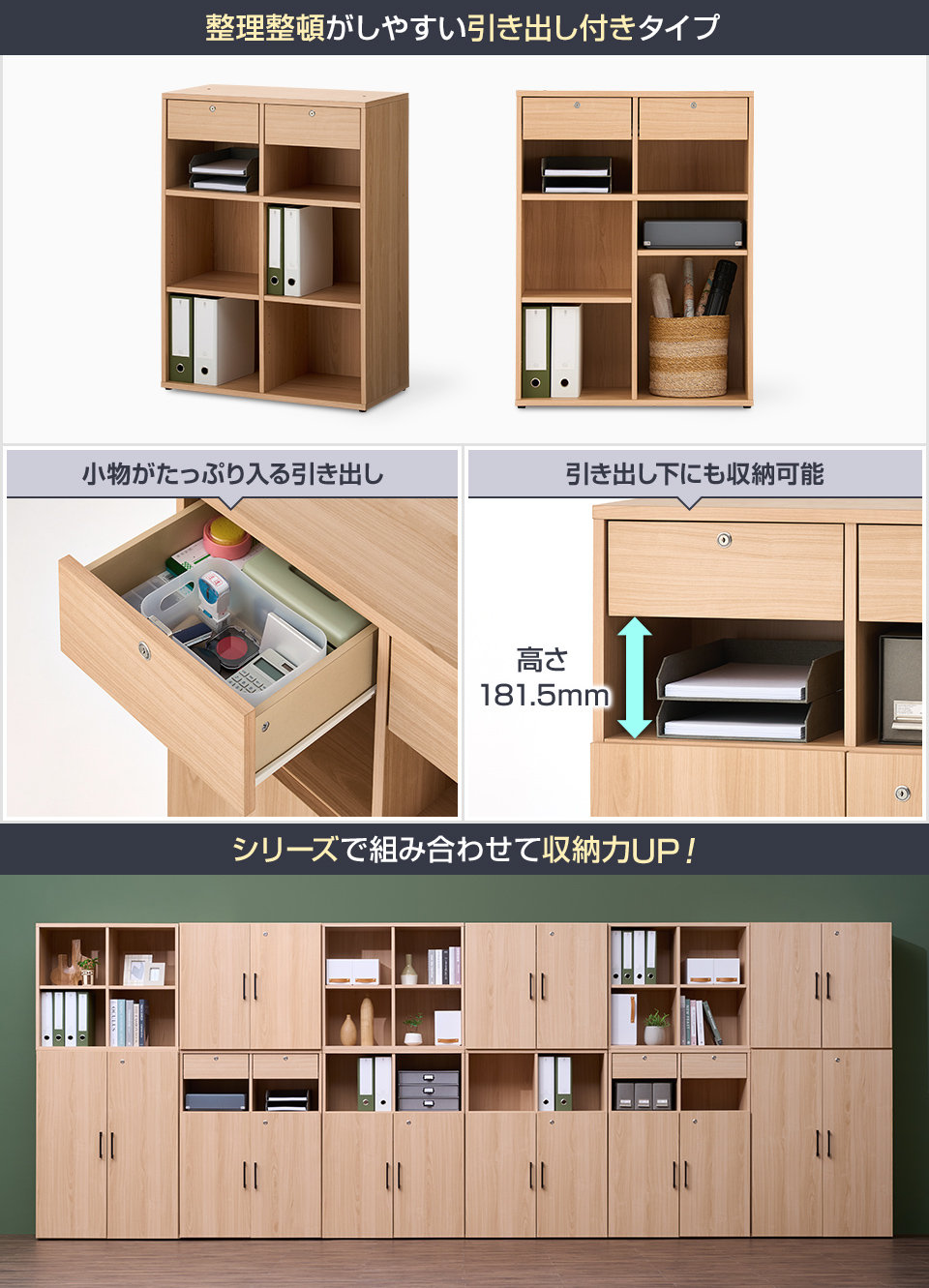 カギ付きの引き出しを備えた利便性の高いデザインも本商品の特徴。さらに注目は豊富なシリーズ展開! 実に40アイテム以上の品揃えで、2段や3段、シンプルなオープンタイプや引き出し付きなど、種類は様々で組み合わせはいろいろ。最大5段まで積み重ねでき、収納物を隠したい場合は別売りの扉を取り付け可能です。お求めやすい価格で、お手軽にオフィス収納一式を揃えることができます。