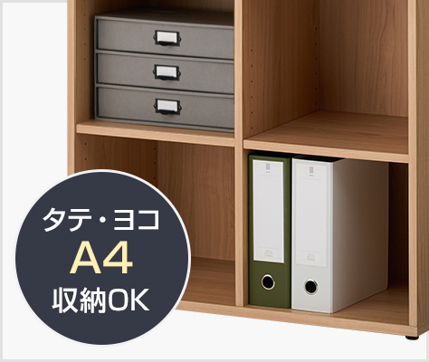 収納部はA4ファイルの縦置き・横置きにも対応。デスク周りの整理整頓に役立ち、すっきりとしたオフィス環境を整えます。