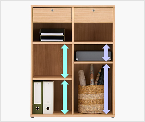 左右の棚板は、別々に高さを調節できます。背の高いファイルや、横置きの書類ケースなど、収納物のサイズに合わせて対応可能です。