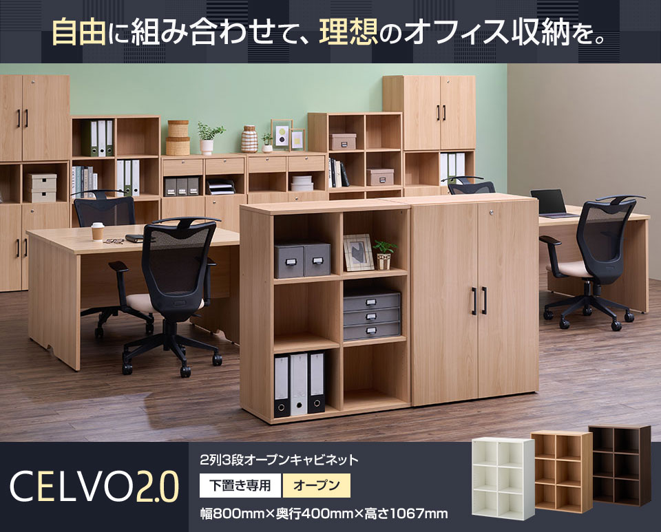 目的や空間に合わせて、自由な組み合わせができるユニット型収納「セルボ2.0 木製キャビネット」。 下置き専用の2列3段オープンタイプです。カラーはホワイト、ナチュラル、ダークブラウンの3色展開で、ベーシックなカラーとシンプルなデザインが多様なシーンに調和します。単体での使用はもちろん、幅広いシリーズ展開を活かした多彩なアレンジが可能。それぞれの環境に応じた理想のオフィス収納を実現できます。