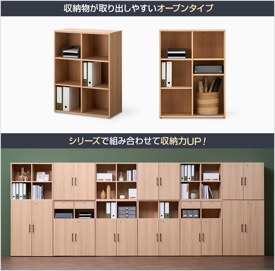 注目は豊富なシリーズ展開! 実に40アイテム以上の品揃えで、シンプルなオープンタイプや引き出し付きなど、種類は様々で組み合わせはいろいろ。最大5段まで積み重ねでき、収納物を隠したい場合は別売りの扉を取り付け可能です。お求めやすい価格で、お手軽にオフィス収納一式を揃えることができます。