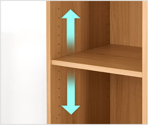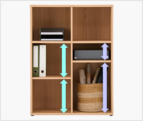 左右の棚板は、別々に高さを調節できます。背の高いファイルや、横置きの書類ケースなど、収納物のサイズに合わせて対応可能です。