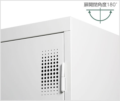 ロッカーの扉は大きく開いて物の出し入れがしやすい開閉角度180°です。扉にはパンチングの通気孔を備え、内部の換気が行えます。