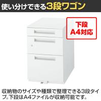 | 機能・特徴 | ・ダブルサスペンションレール ・引き出しラッチ機能付き(ペントレー引き出しは除く) ・ストッパー付き ・ペントレー付き(1段目) ・キャスター付き(4箇所) ・A4ファイル対応 |
