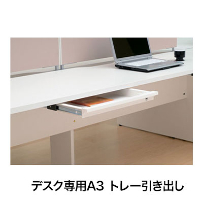 ビーフォレットシリーズの対応するデスクには専用の引出しを取り付けることができます。A3トレーの引出しがデスク周りの収納を担います。ちょっとした書類や小物を入れておくのに適したサイズです。