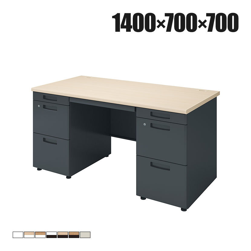 | サイズ | 外寸 / 幅1400×奥行700×高さ700mm 下肢空間 / 幅608×奥行605×高さ622mm 天板厚さ / 29mm センター引き出し内寸 / 幅555×奥行382×高さ35mm 袖(上段)内寸 / 幅328×奥行435×高さ59mm 袖(中段)内寸 / 幅318×奥行435×高さ265mm 袖(下段)内寸 / 幅318×奥行540×高さ265mm |
