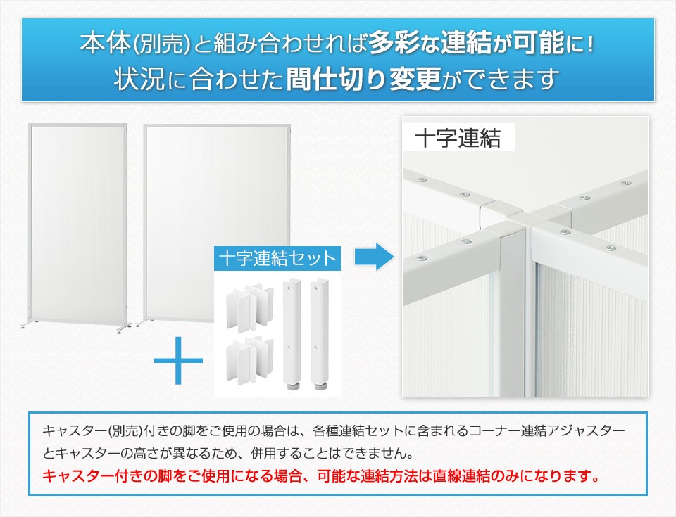 別売本体と十字連結セットを組み合わせれば、十字連結が可能になり、空間の間仕切り方法の幅が広がります。(※キャスター付きの脚をご使用になる場合、各種連結セットと併用することはできません。可能な連結方法は直線連結のみになります。)