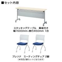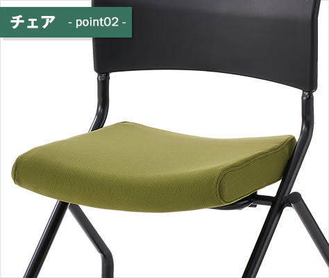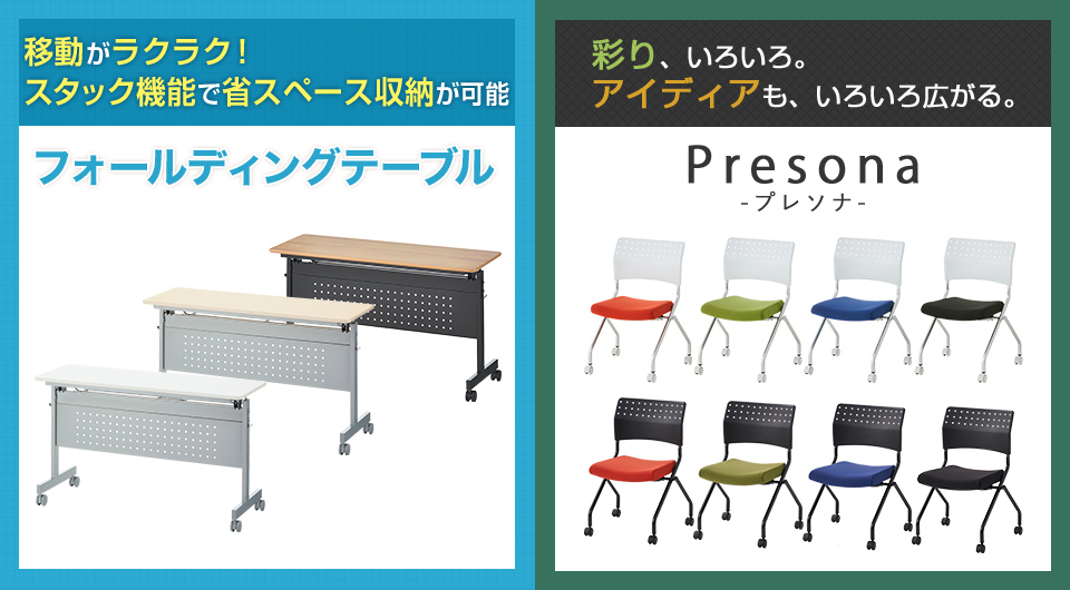 片手でラクラク折りたためるフォールディングテーブルと、彩り多彩なミーティングチェア、プレソナをセットでお届けします。チェアは、柔らかなライトグレーとシックなブラックの2色をベースに、個性ある4色の座面カラーからお選びいただけます。