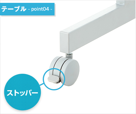 キャスター脚なので移動がラクラク。設置が素早く行え、片付けも簡単です。座る側のキャスター2個にはストッパーが付いており、動かないよう固定することもできます。