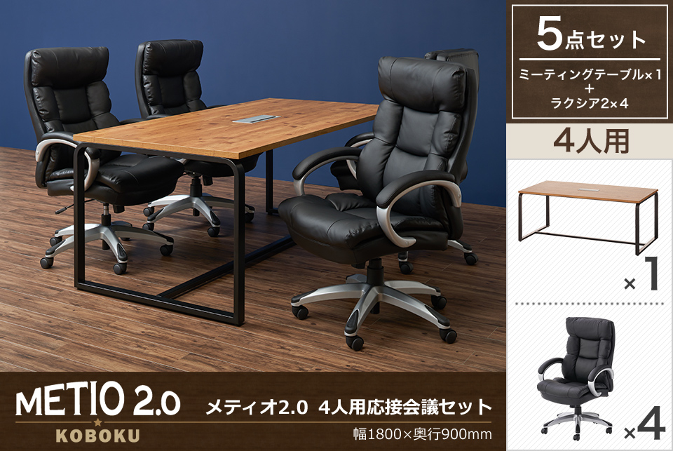 シックな古木調の風合いが美しい「METIO2.0」のミーティングテーブルと、ソファのように弾力性の高いクッションにゆったりと座れるチェア、ラクシア2をセットでお届け!高級ソファにも採用されているコイルスプリングとシリコンフィルがもっちりと柔らかく、長時間に及ぶミーティングでも疲れづらい座り心地です。お客様をおもてなしする場面でも活用できる、落ち着きと高級感のある4人用セットです。