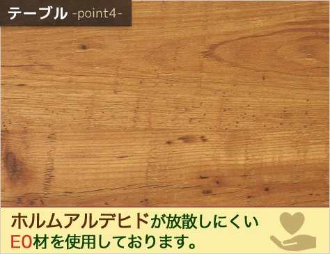 味わい深い色の天板表面は、古木のような木目調のシボ加工を施しています。さらに傷・汚れに強いメラミン樹脂化粧板を使用。