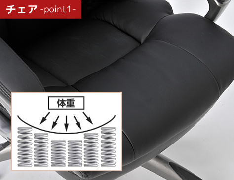 | 材質 | 背座 / PUレザー、ウレタンフォーム、合板、ポケットコイルスプリング、スチール、シリコンフィル 脚部 / ナイロン、スチール 肘部 / PP樹脂成型品 キャスター / ナイロン |