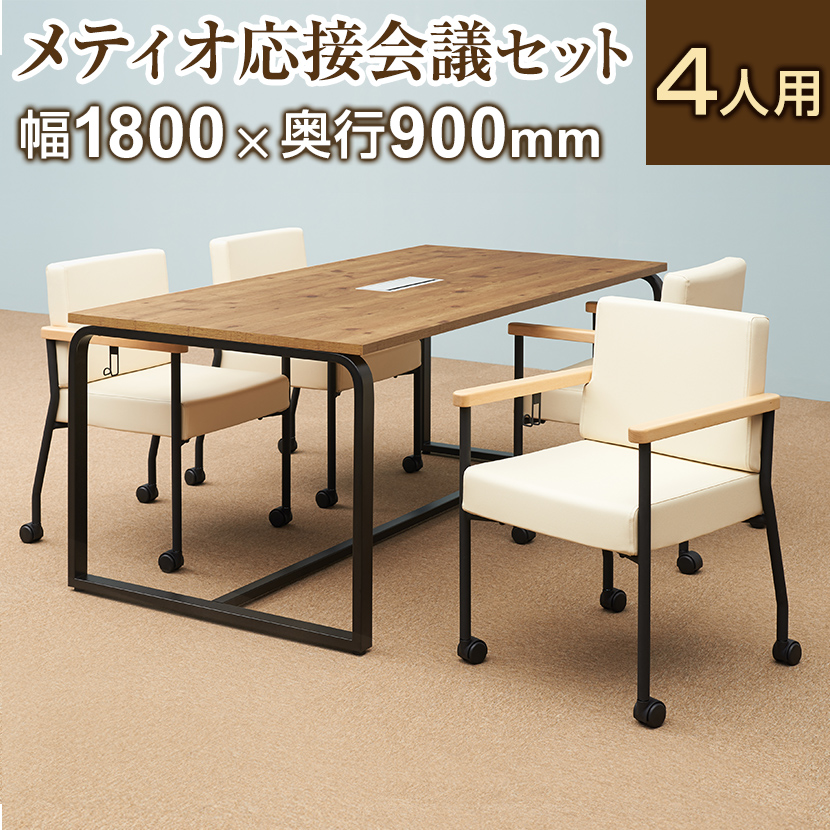 シックな古木調の風合いが美しい「METIO2.0」のミーティングテーブルと、厚いクッションでお客様をもてなすチェア、ソフィディアをセットでお届け!落ち着いた印象をもたらす古木調と、ソファ感覚のゆったりとした座り心地は、社内会議から商談・応接シーンまで幅広く活躍します。オフィスや空間イメージに合わせて選べるカラーバリエーションをご用意しました。テーブルは、ゆったりとした間隔で座れる幅1800mmタイプです。