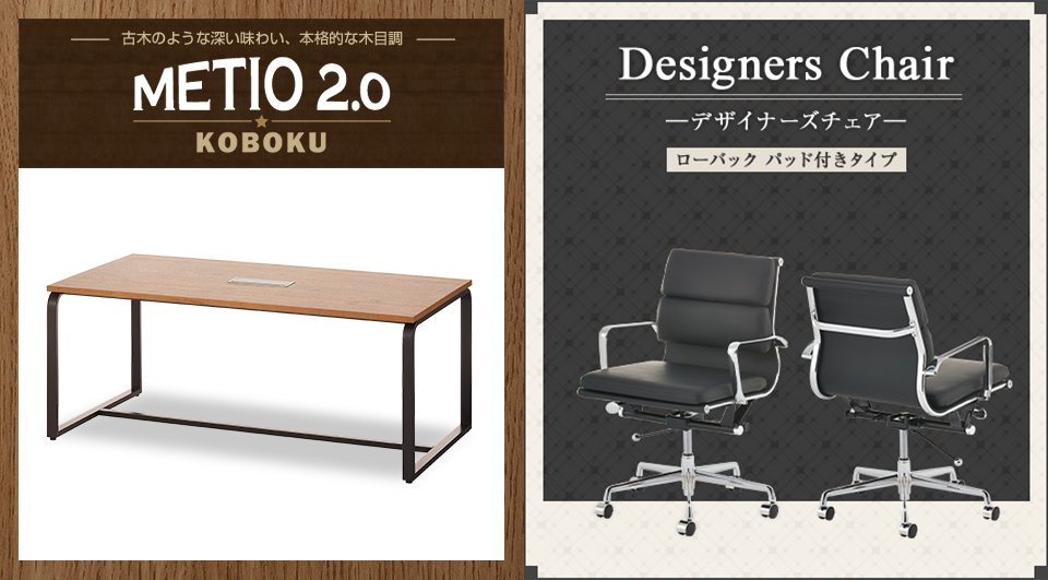 シックな古木調の風合いが美しい「METIO2.0」のミーティングテーブルと、滑らかな曲線と美しいフォルムが、さまざまな空間で存在感を発揮するデザイナーズチェアをセットでお届けします。モダンかつクラシックな印象で、オフィスからホームまで幅広い場面に調和する、上品な落着きのある組み合わせです。