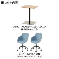 コンパクトで手軽に使いやすいカフェテーブル「レシル」と、丸みのあるフォルムが身体に寄り添うようにフィットする「CPアームチェア(2脚)」をセットでお届けします。CPアームチェアは、ゆるやかなカーブが腕を支える肘付きタイプ。ファブリックで背座面を覆った張りぐるみ仕様で、温かみのある木製天板を使用した「レシル」との相性も良好です。軽い休憩やちょっとした打ち合わせなど、幅広いシーンで活用できます。