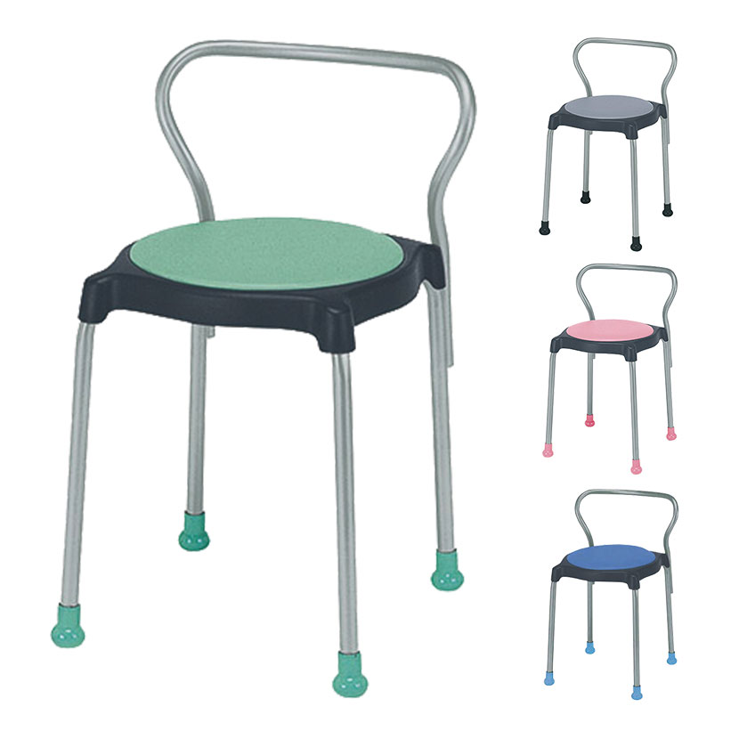 シンプルデザインのビニールレザー張り丸椅子です。脚先の滑り止めキャップ付きはシートカラーと合わせた配色で、機能性に加えてデザインのアクセントとなり、空間にポップな彩りをもたらします。収納時は4脚までスタッキングでき、省スペースに収まります。