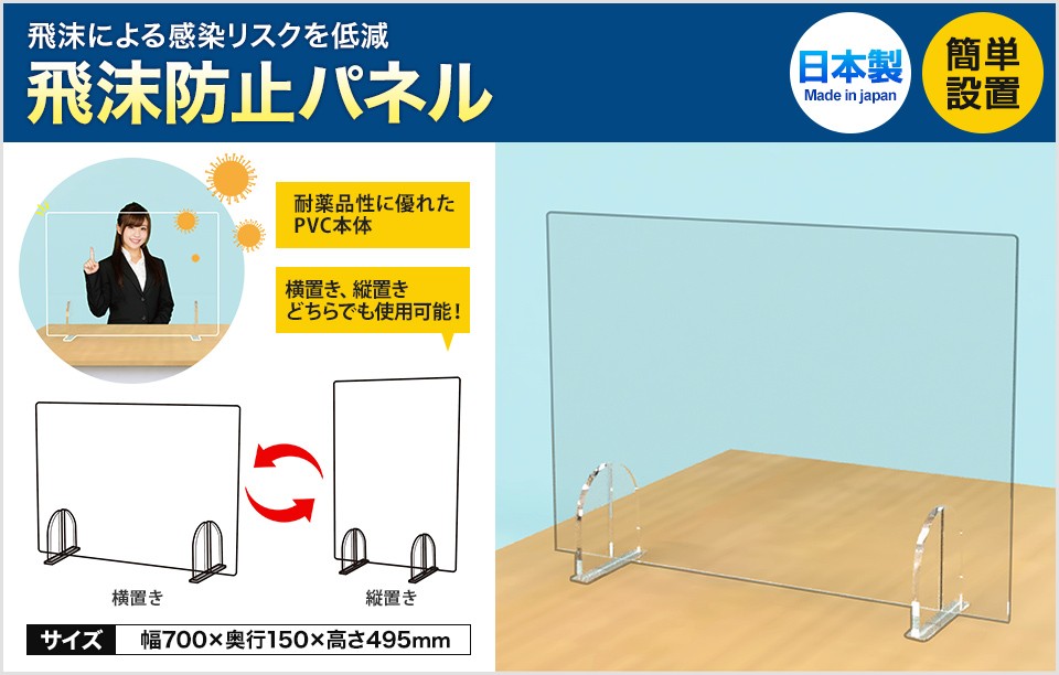 飛沫による感染リスクを低減するための、飛散防止用の透明板です。アルコール・次亜塩素酸に強く、耐薬品性に優れたPVC本体。台座を自由に動かせるので、横置き、縦置きどちらでも使用できます。受付やカウンターなどの対面での接客業務や、社内のデスクワーク時にご利用ください。下部にスキマがあるので、パソコンなどの配線を通すことも可能です。