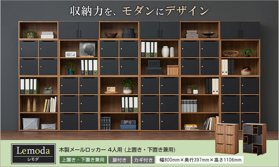 フリーアドレスなどフレキシブルなオフィスに!最大6段積み重ねられる個人用の「Lemoda」メールロッカーです。上段は投函書類、下段は私物など分別して収納可能。棚板を取り外せば、A4縦置きがピッタリの書類収納に早変わり!扉には、ソフトクローズ機構・取っ手を兼ねた投入口・セキュリティ性を高めるカギを搭載し、扉カラーはホワイト、ナチュラル(本体同色)、ブラックの3色展開。同シリーズのキャビネットを組み合わせることも可能です。