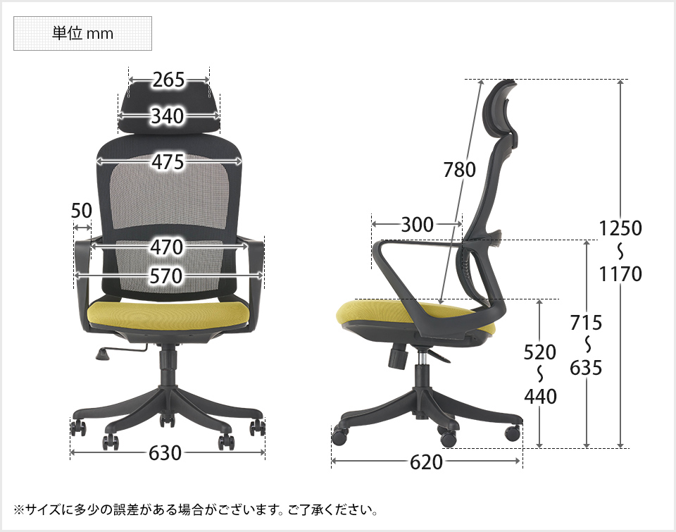 | サイズ(本体) | 外寸 / 幅630×奥行620×高さ1170〜1250mm 座面高さ / 440〜520mm 座面幅 / 470mm |