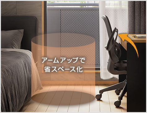 デスク下に完全収納できる「アームアップ機能」で、限られたスペースを有効活用。整然としたオフィス環境と、在宅ワークでの快適な空間づくりをサポートします。仕事に集中する時間はもちろん、アームを上げて趣味を楽しむ時間にも寄り添う。オンとオフを、この一脚で切り替えます。
