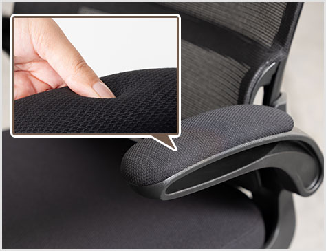 肘を置いた際に負担がかかりにくい、クッション性のあるアームレスト。硬い樹脂製のアームに比べ、腕への負担を和らげます。