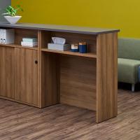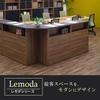 温もりのある古木調の風合いを活かした「Lemoda」シリーズのカウンターです。立ったまま応対できる高さ1000mmのハイタイプで、お客様側と執務側の両側に、手荷物や備品を置ける下棚付き。落ち着いたモダンなデザインは、オフィスや店舗など幅広い空間に調和し、接客スペースに対話しやすい空気をもたらします。穏やかで上品なダークグレーの天板は、傷や汚れに強いメラミン化粧板を使用。複数を連結してレイアウトすることも可能です。