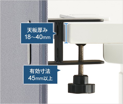 天板の厚みは40mmまで、有効寸法は45mm以上であれば取り付けられるクランプ式を採用し、多くのデスクに対応します。